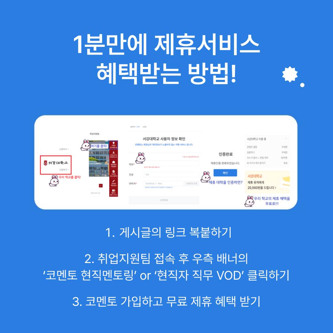 - 이벤트 기간 내 제휴 전환을 하지 않았더라도 서강대 학생으로 코멘토를 가입했음을 인증하면 이벤트에 참여할 수 있습니다.