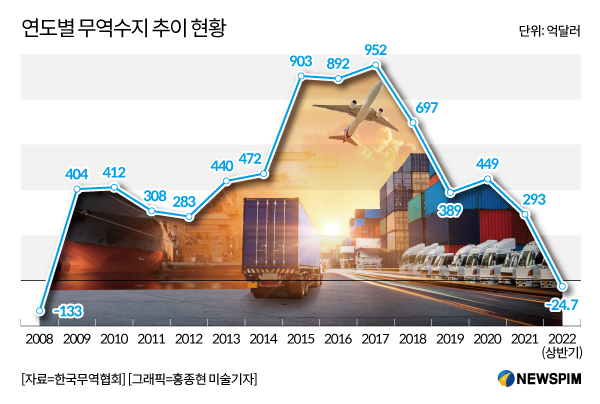 무역수지는 그 전부터 감소 추세였음. 그 무역적자가 윤석열 정부만의 탓으로 돌리는 건 쉽지 않고 여러 대외여건이 어렵다는 소리겠지. 반도체 산업이 힘든 건 워낙 유명하고