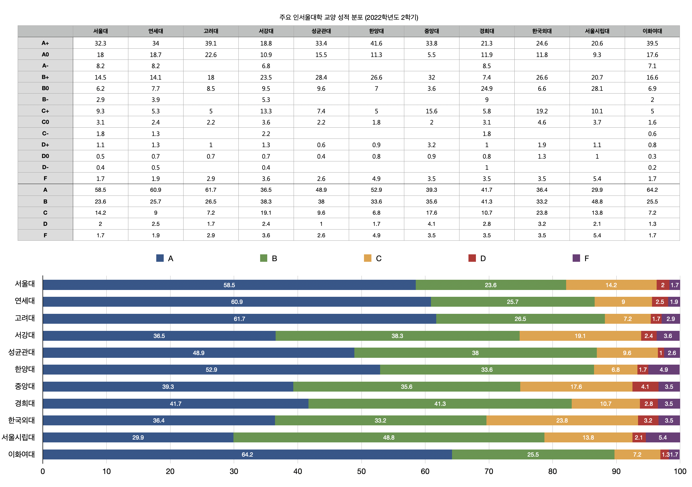 저번학기 교양과목 여기 있는 대학 중에 시립대가 A 비율 제일 낮고 우리학교가 A+ 비율 제일 적게 나왔어.
