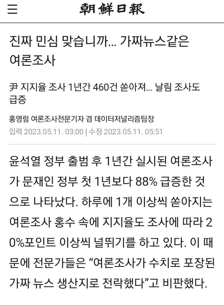 아무리 조사 회사가 다르다지만 같은 질문에 대해 비율이 20%p 이상 차이나는 것에 대해 무슨 생각이 드냐?