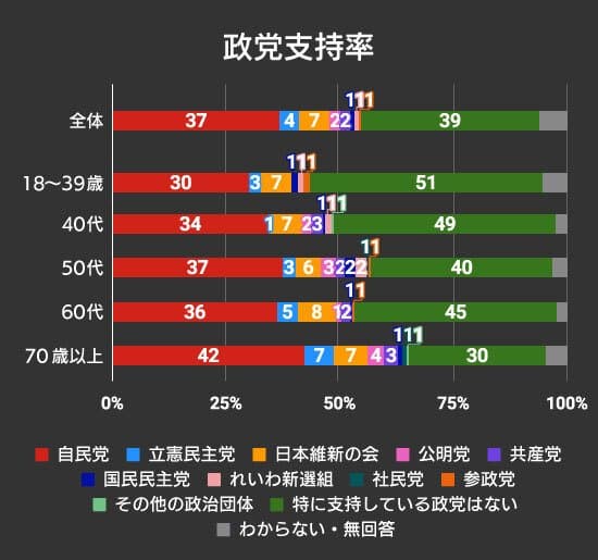 18세~39세 자민당 30% 입헌민주당 3% 유신회 7%
