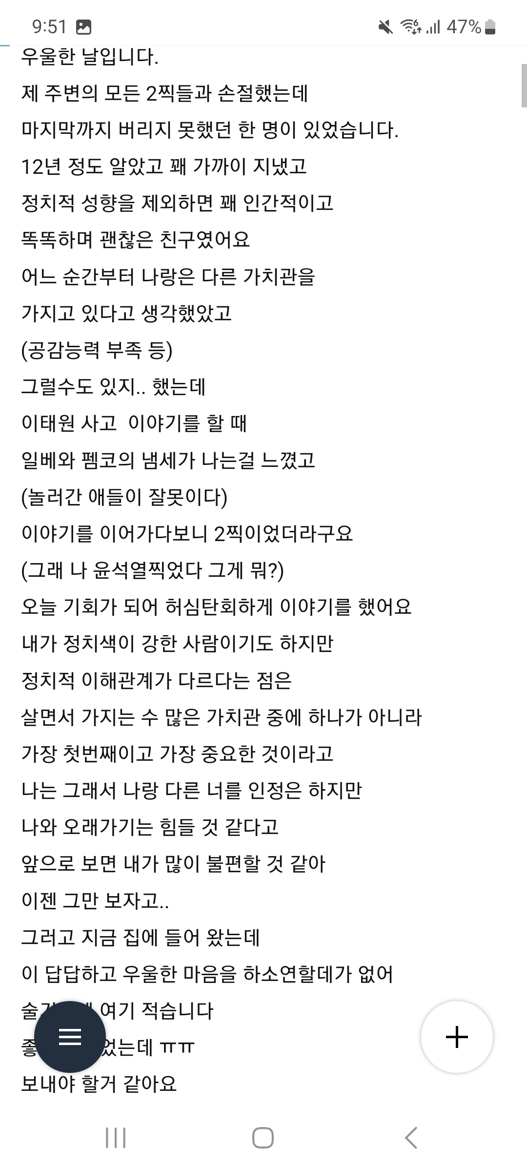 현실에서 정치얘기 하면 깊은 관계 아닌이상 거리두는게 맞다고 생각함. 정치성향은 바뀌는일 거의 없어서… 특히 남 말듣고 정치성향이 바뀐다? 불가능임