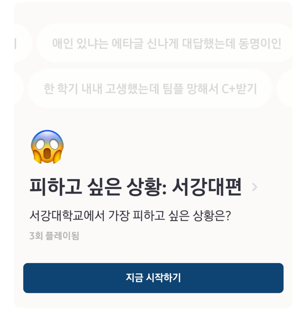 통해 앱을 설치하실 경우, 서강대 맛집 월드컵과 서강대 피하고 싶은 상황 월드컵도 플레이하실 수 있습니다. 많은 설치 부탁드립니다!***