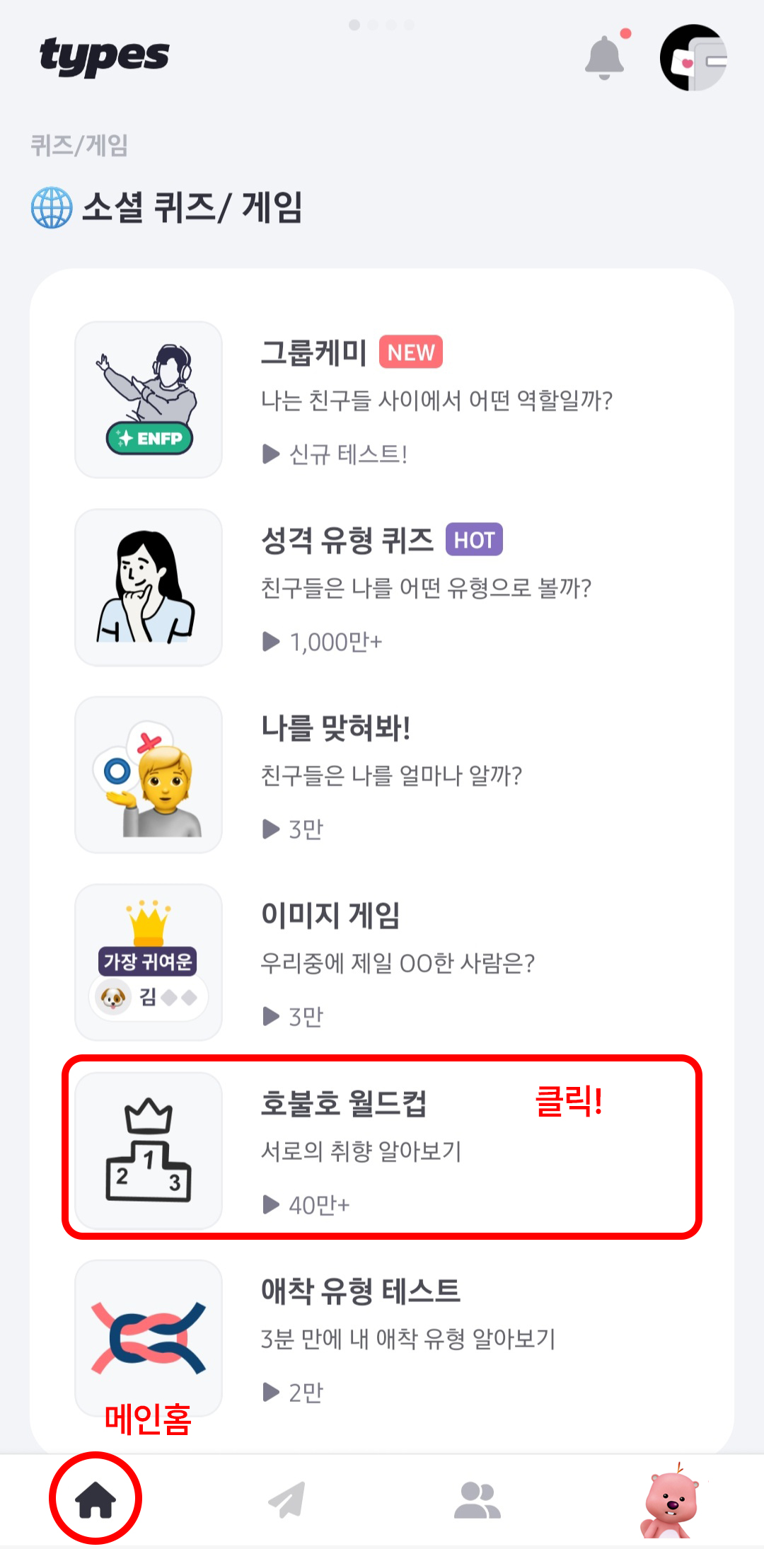 3. 홈 화면에 내리다 보면 ‘호불호 월드컵’ 클릭!
