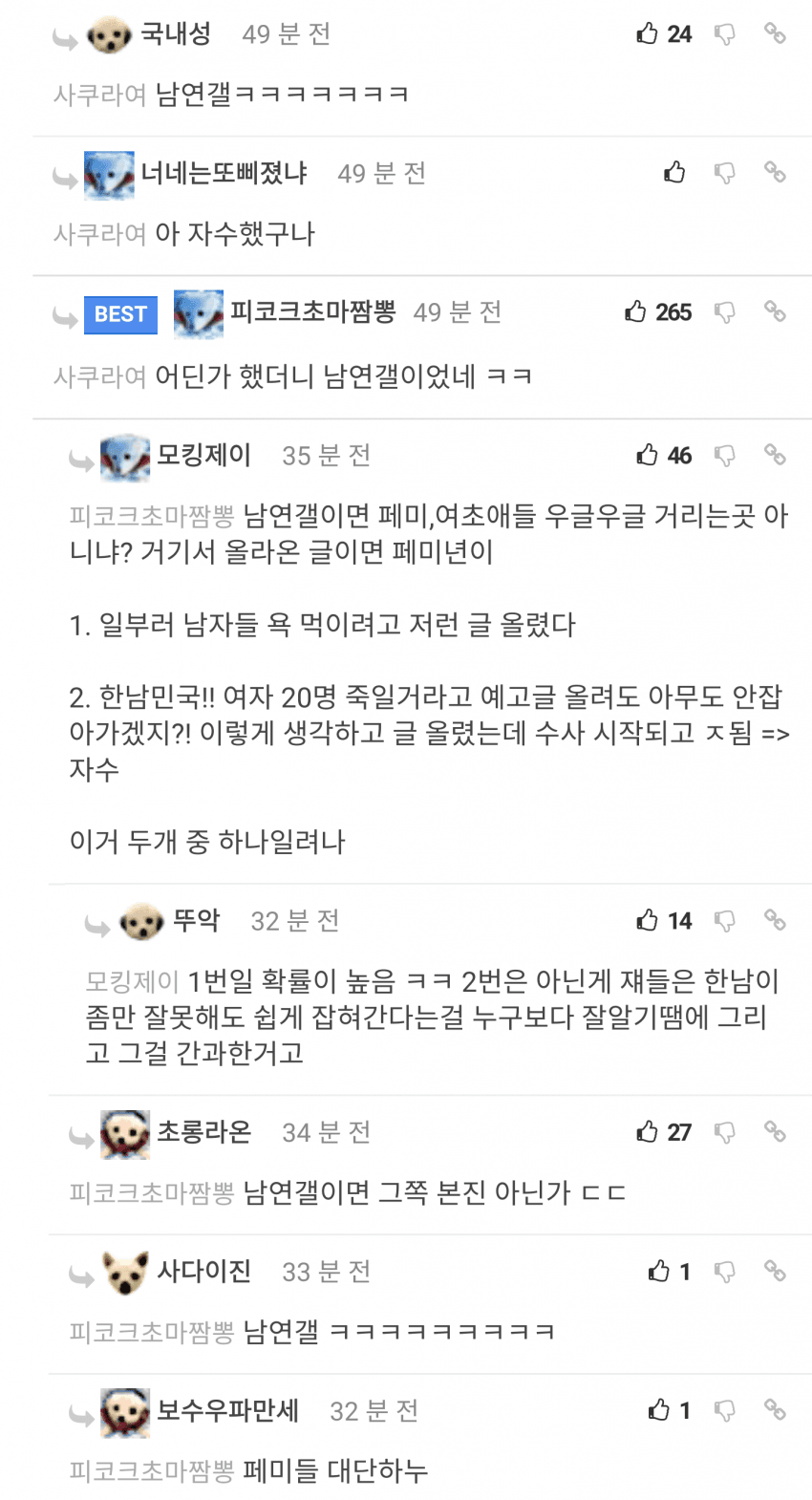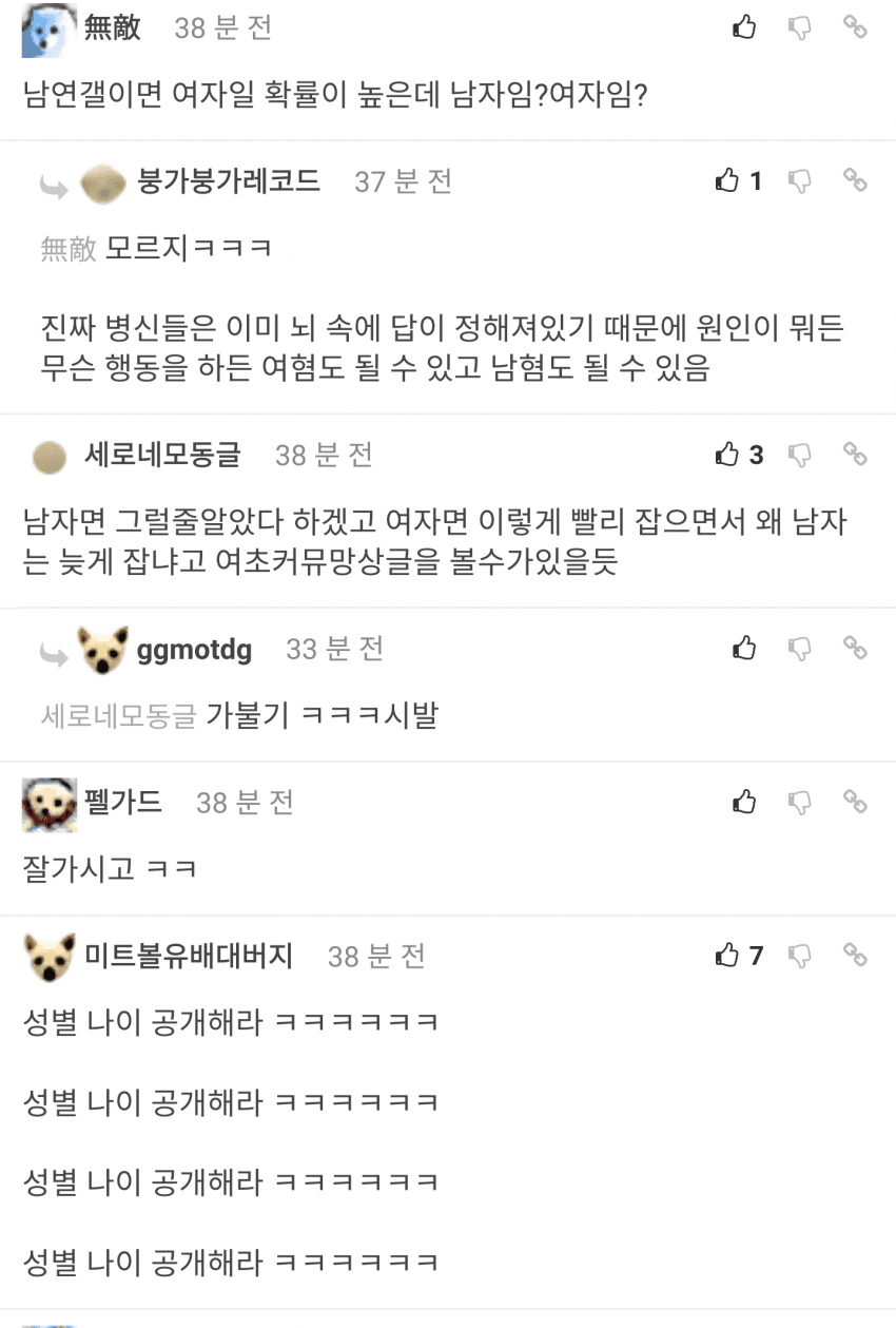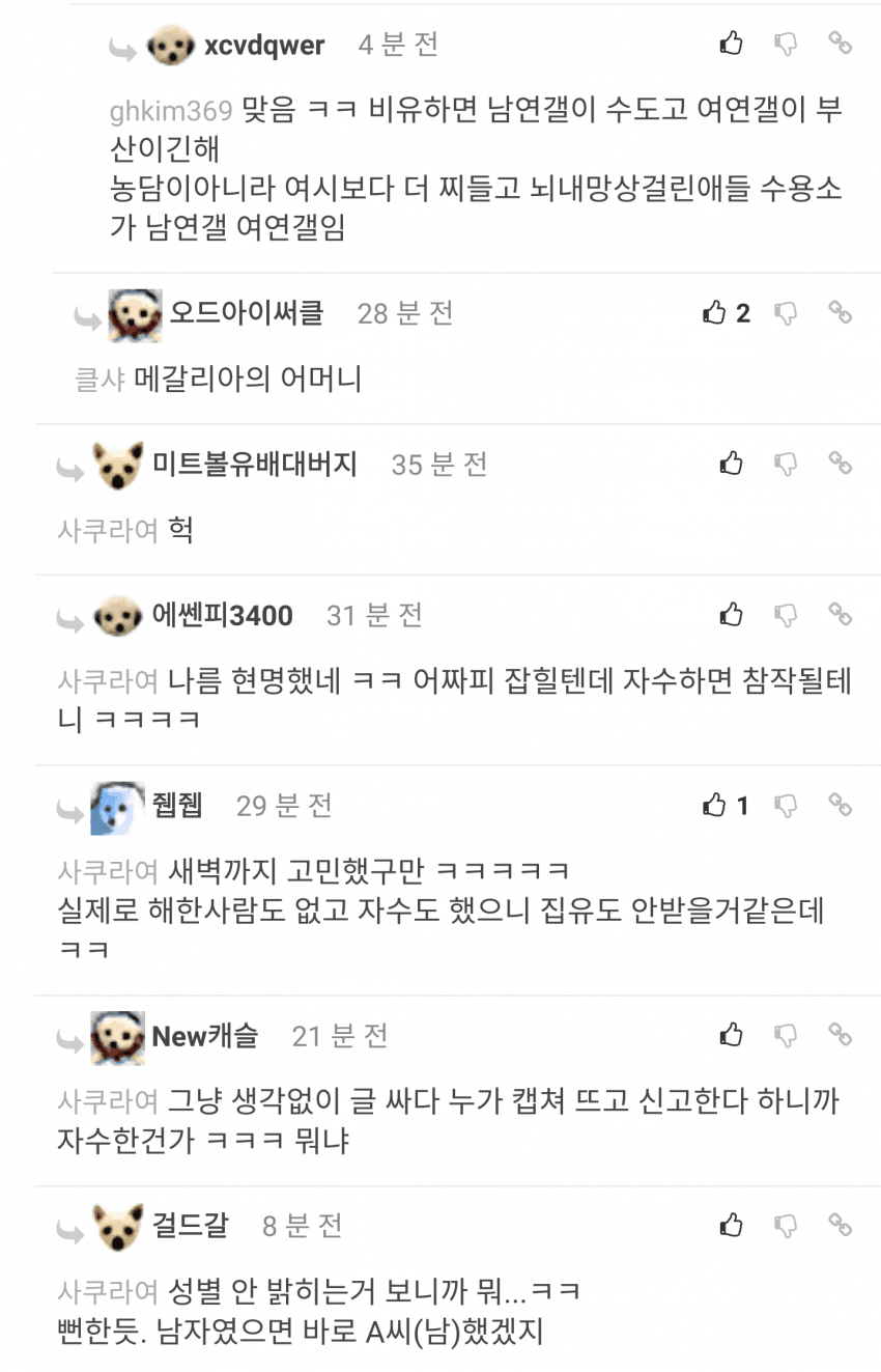 신림 사건 때 남연갤 애들이 조롱하는거 ㅈ된대서 본건데 ㅋㅋ 쌉여초 갤을 왜보겠뉴!!