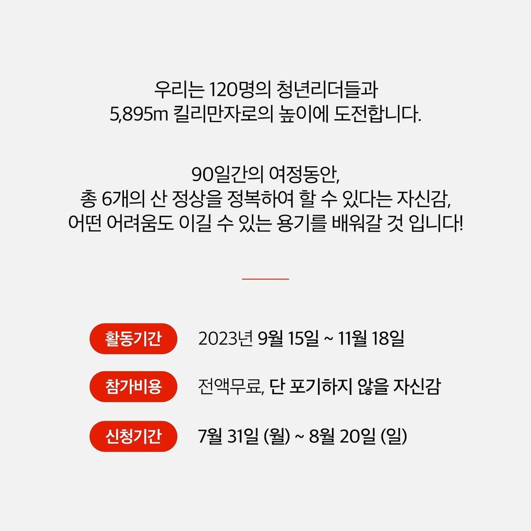 5,895m 킬리만자로의 높이에 도전할 120명의 청년리더를 모집합니다!