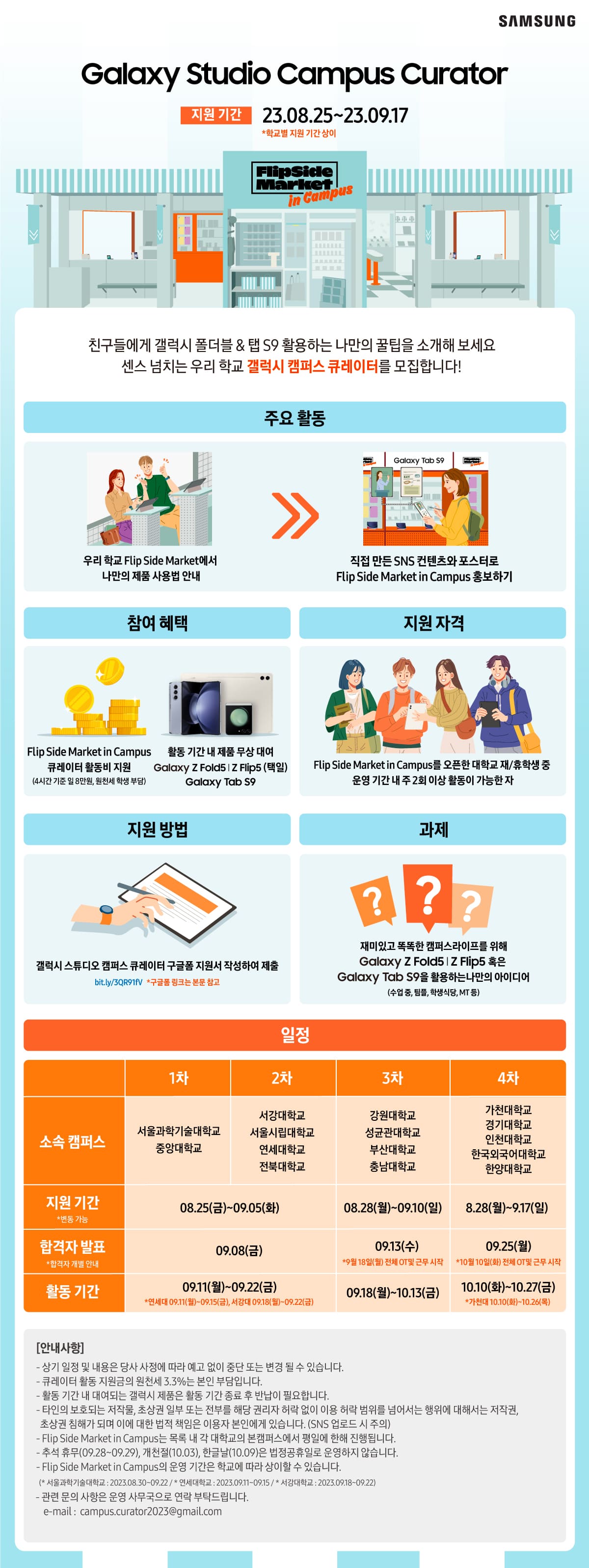 ■ 참여 혜택 I Flip Side Market in Campus 큐레이터 활동비 지원 (4시간 기준 일 8만원, 원천세 3.3% 본인 부담) 및 활동 기간 내 Galaxy Z Fold5 I Z Flip5(택일), Galaxy Tab S9 무상 대여