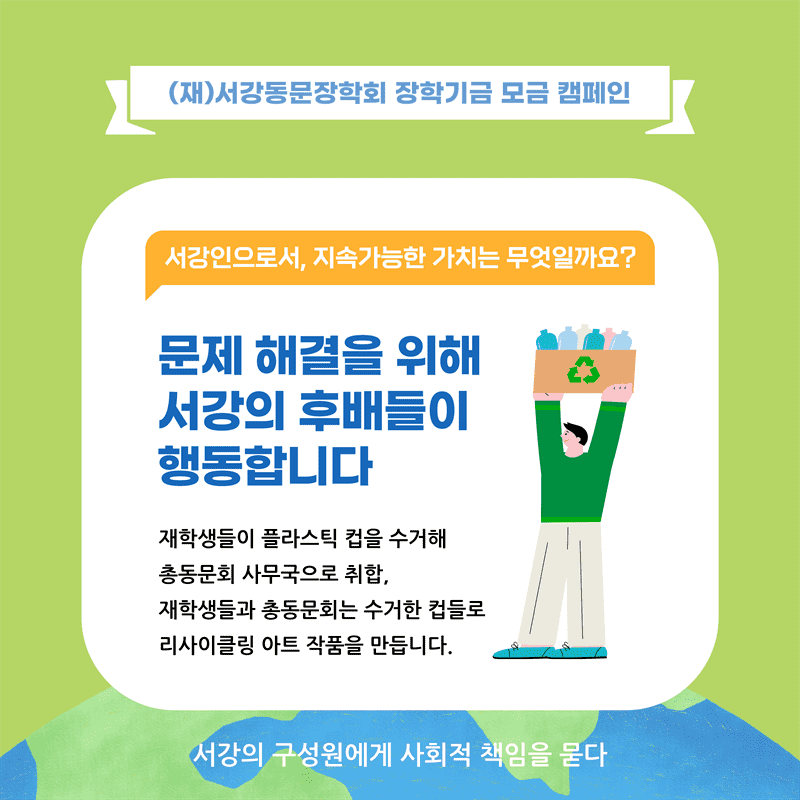 저희가 장학기금 모금을 위해서, 기후 환경 이슈와 맞물려 가시적인 성과를 낼 수 있는 재학생들의 모습을 보이기 위해서 모금 캠페인을 하고자 합니다.