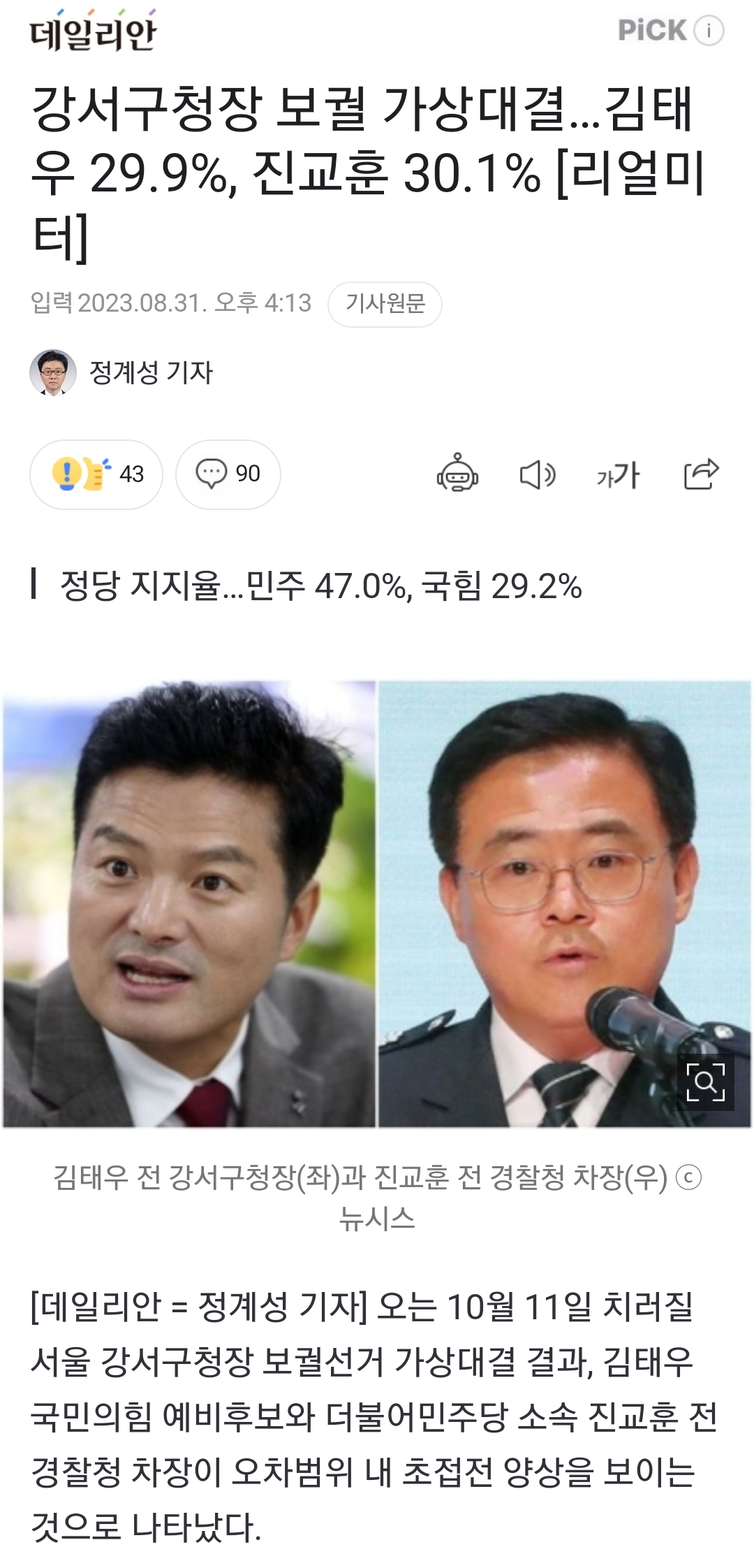 애초에 강서지역에 국힘 민주당 비율이 비슷한게 더 이상한대