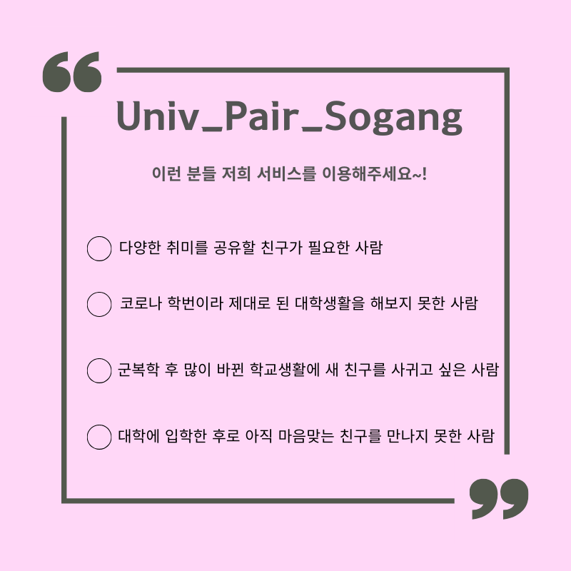 유니브페어 서강은 서강대학생을 대상으로 취미, 성향, 나이, 성격, 성별 등을 종합적으로 분석하여 각자에게 딱 맞는 친구를 매칭해주는 서비스를 제공하고 있습니다.