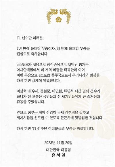 그리고 대통령 축전에 롤드컵이 뭐냐 리그 오브 레전드(LoL) 월드 챔피언십(롤드컵)로 하던지