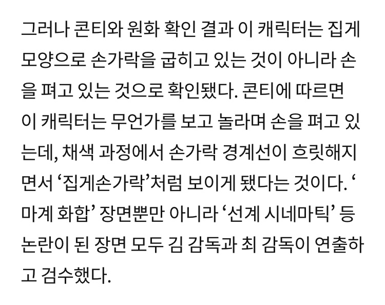-> 콘티에선 없었지만 채색과정에서 손 경계선이 흐려져서 집게손처럼 ‘보이게’ 되어버렸다