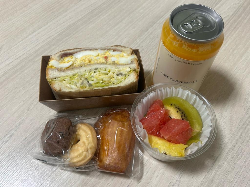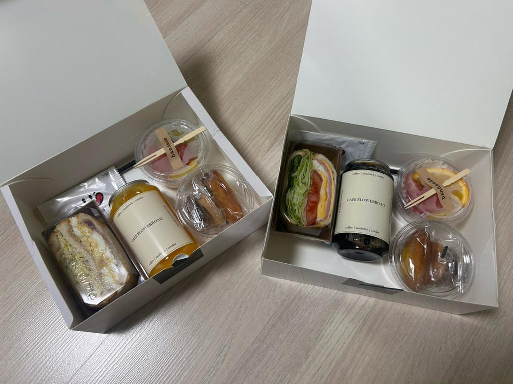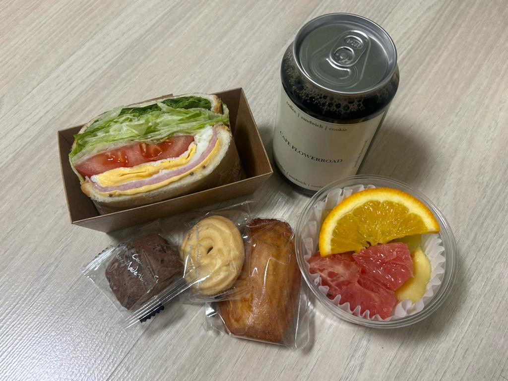 샌드위치 반개랑 과일컵, 음료, 빵 이것저것 들어있는데