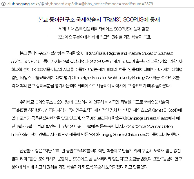 그리고 영국 타임즈 대학평가에서 SCOPUS 등재여부를 지표로 사용하기 시작해서 중요해 졌다고 합니다
