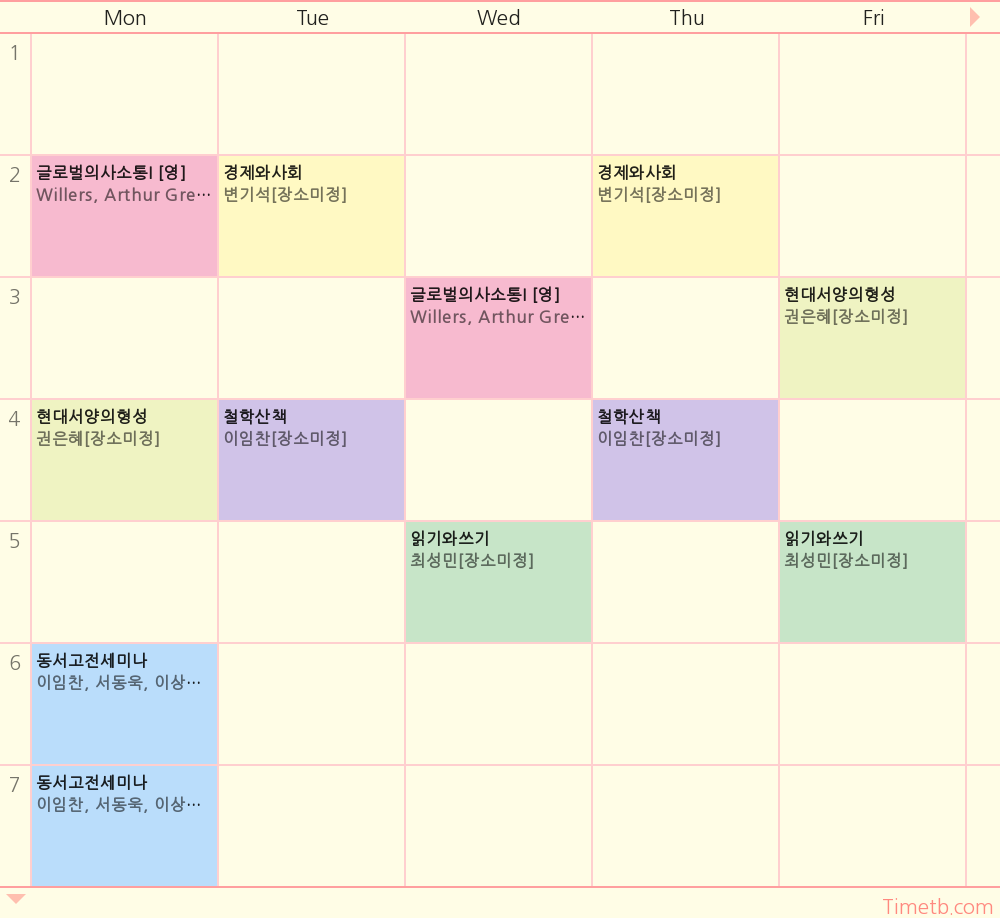 수강후기랑 교시(?)별 시간, 밥시간 참고해가면서 겨우겨우 짜봤는데 어떤가요?? 월요일이 좀 힘들어보이긴 하는데 ㅎㅎ..