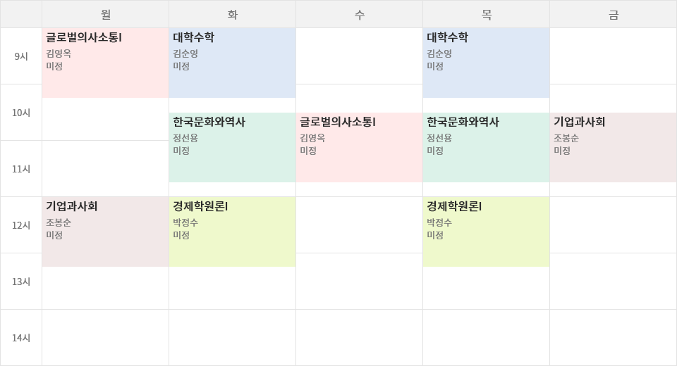 시간표 깔끔하게 짜셨네요 ! 듣고싶은 일반교양 하나 추가해보셔도 좋을 것 같아요