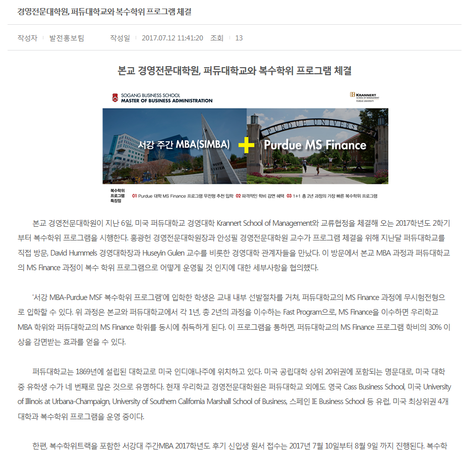 서강대 MBA 1년을 마친 후 무시험 전형으로 퍼듀대에 입학해서 1년을 마치면 복수학위가 나옵니다.