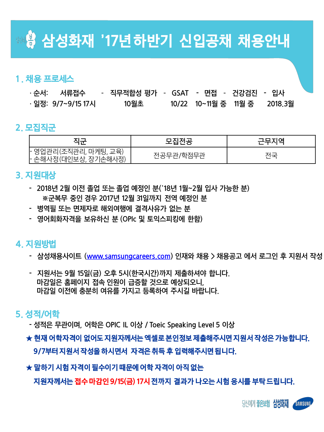 [채용공고] 삼성화재 2017 하반기 대졸 신입사원 모집 (9.7~9.15)