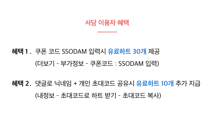 댓글 혜택은 초대코드와 함께 닉네임도 적어주셔야 하트 지급이 가능합니다 :)