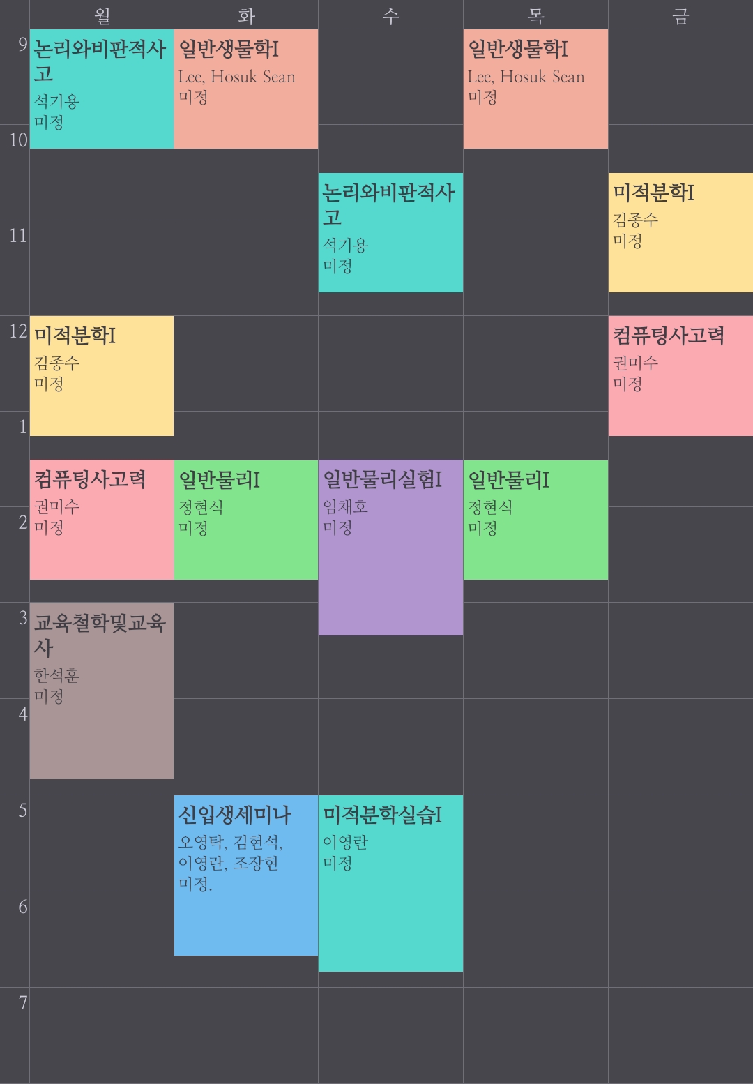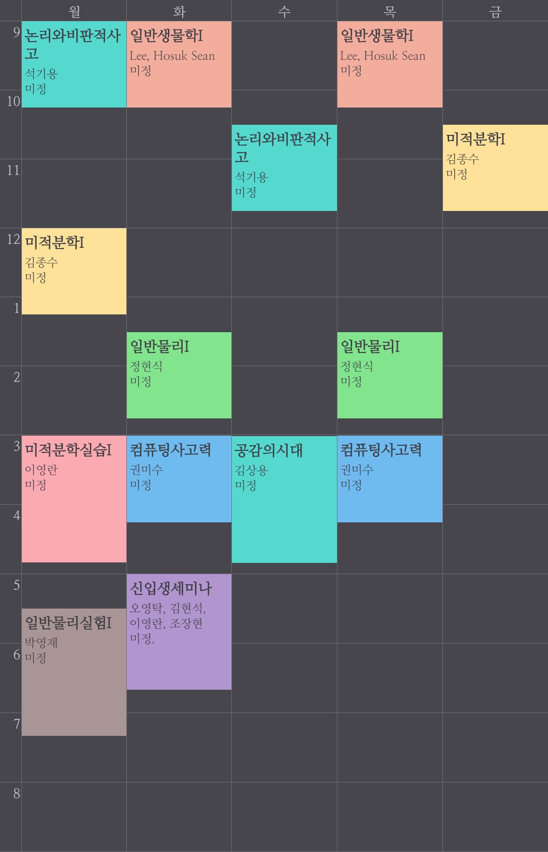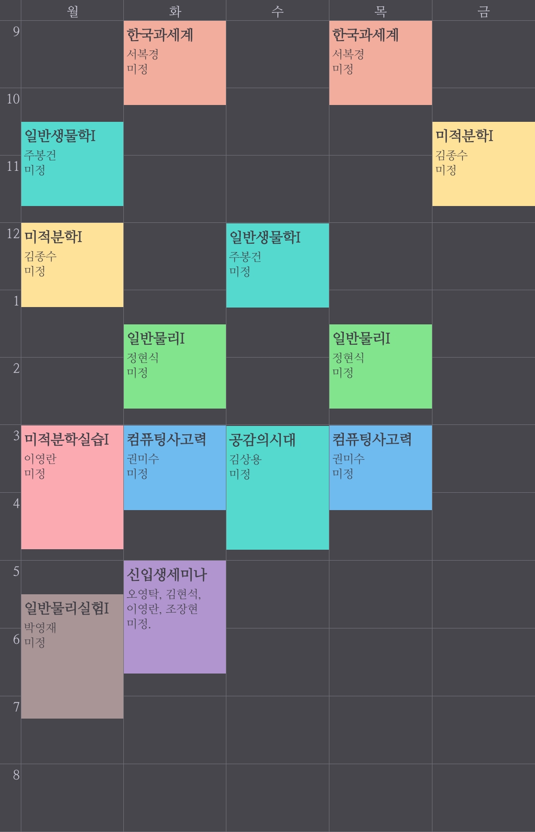 시간표의 전체적인 밸런스는 좋은 것 같아요! 다만 중간중간 애매하게 빈 시간들이 있으니 과방이나 동방 잘 활용하시길!