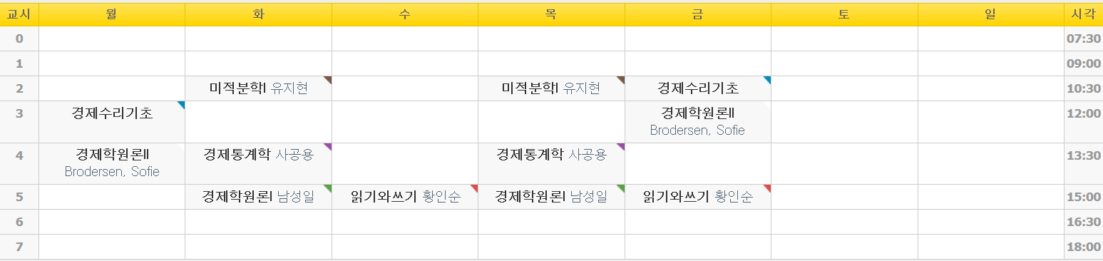 읽쓰대신 선대 넣으면 제 1-1 시간표인데 이전에 경제과목 들었으면 좀 더 수월하겠네요