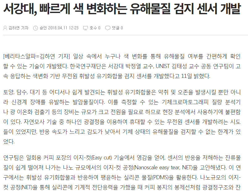 박정열 교수는 “색 변화로 수 초 이내에 기체 상태의 유해물질을 검지할 수 있어 누구나 쉽게 육안으로 환경을 모니터링을 할 수 있을 것”이라며 “나아가 다양한 지능형 하이드로젤을 활용하여 광결정 기반의 복합형 센서를 개발함으로써, 여러 환경오염원의 동시 검출이 가능하다”라고 연구의 의의를 설명했다.