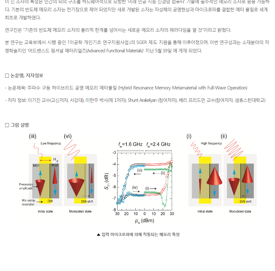 새로 개발된 소자는 마이크로파 주파수로 조절된다. 이 신 소자는 인간 뇌의 구조를 모방한 미래 인공지능 신경망 컴퓨터 기술에 필수적인 메모리 소자로 응용할 수 있다