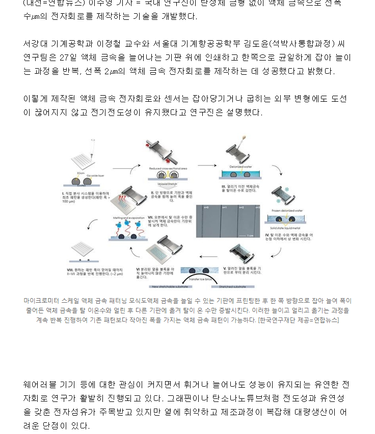 이정철 교수는 "자체 개발한 액체 금속 프린팅 및 상변화 패터닝 방식으로 탄성체 금형 없이 2㎛ 폭의 액체 금속 패턴을 제작했다"며 "앞으로 플랙서블 디스플레이, 웨어러블 기기, 플랙서블 센서 등 다양한 분야에 적용될 것으로 기대한다"고 말했다.