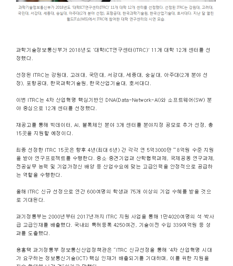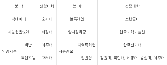- 카이스트, 포스텍, 고려대, 서강대, 아주대, 국민대, 숭실대, 세종대, 강원대, 산기대, 호서대 선정