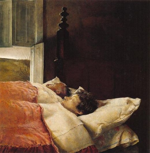 사실 이 작품 속 모델은 살아있는 사람들이야. 20세기 현실주의 화가인 Andrew Wyeth는 이웃 집 노부부의 집에 들렀다가 부부가 잠든 모습을 보고 깊은 인상을 받고 그렸다고 해. 비록 핏기없는 표정과 새벽의 황량한 풍경이 작품의 제목과 어우러져 우리에게 던지는 메세지는 분명하지만, 나는 그래도 이불의 붉은 색과 이 부부가 한 이불 아래서 같이 잠든다는 것에서 한 평생을 짝으로 살아온 사람들만의 연대가 아닐까, 하는 생각도 들어. 다미들은 어떻니?