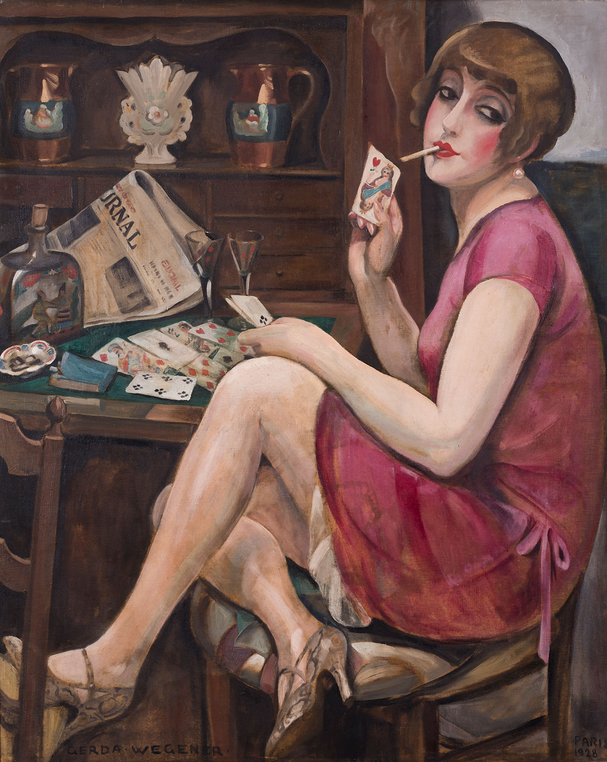 Lili는 앞에 술병을 둔 채 담배를 물고, 트럼프를 하던 중에 퀸 하트를 들어 보이고 있어. 이 퀸 하트의 의미는 고대 그리스 신화로 올라가야 해. 제우스와 레다의 딸 헬레네는 절세미모로 트로이 전쟁을 일으킨 불씨가 되기까지 했다지? Lili는 바로 이 카드를 들어 보이고 있어. Gerda는 이 카드로 Lili를 인정할 뿐 아니라 나아가 그녀의 여성성을 극대화시키고 있어. 이제 이 작품을 다른 작품과 비교하니, 이제 Lili는 매끄러운 얼굴선과 발그레한 장밋빛 뺨까지 완벽하게 아름답고 매력적인 여성으로 다가 와. 욕망에 충실한 Lili는 위험해 보이기도 하지만, 자유롭고 또 아름답지!