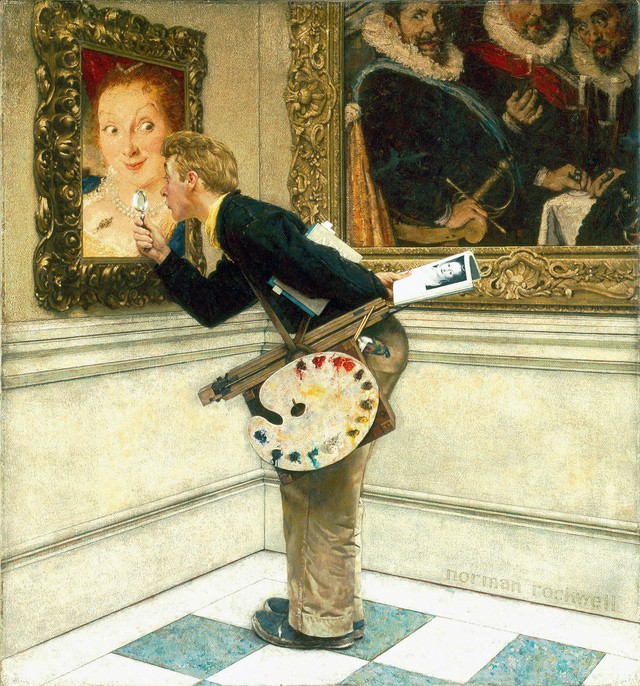 노먼은 삶이 참 힘든 사람이었지. 그의 일생이 세계 대전과 대공황에 걸쳐 있었을 뿐 아니라 유명 잡지의 광고 일러스트레이터로 사회에서 가족의 붕괴를 직접 체감해야 했고 본인 역시 아내의 외도와 사별로 결혼 생활이 행복했어도 오래가지 못한 경험이 있었기 때문에, 그가 작품으로 말하고자 한 것 중 하나는 가족의 소중함, 안정감이었어. 이는 당시 미국 대중이 이상적으로 여기던 가치와 일맥상통했기 때문에 일러스트레이터로서 유명세를 떨쳤어. 다만 비평가들은 너무 현실과 거리가 멀고 지나치게 감상적이라는 이유로 그의 작품에 혹평을 했어. 그리고 노먼 록웰은 재치있는 아티스트였지.