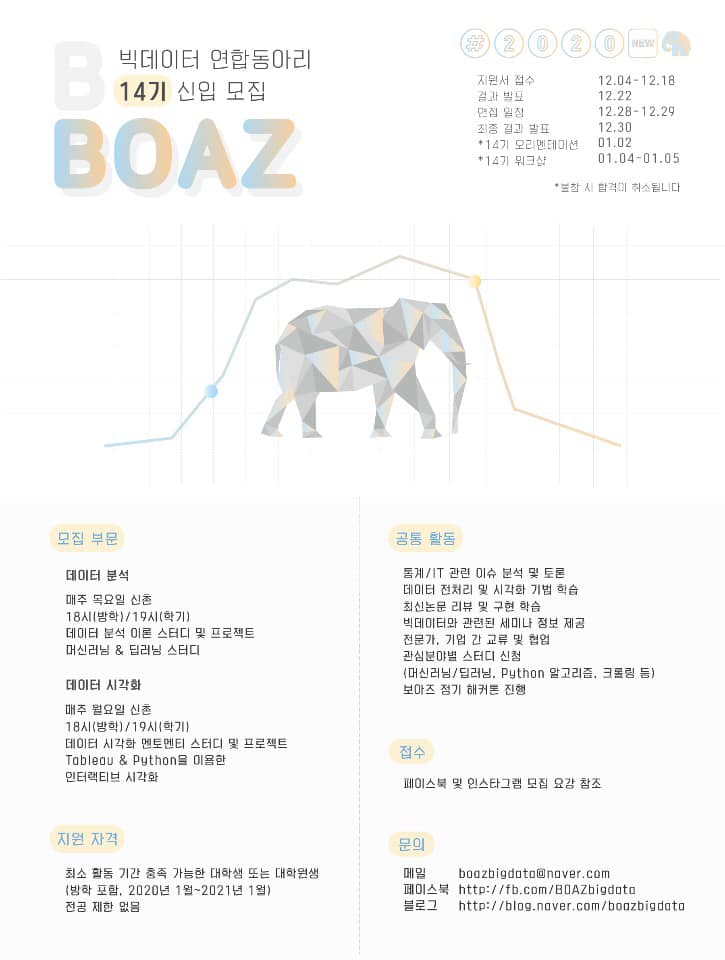 국내 최초 빅데이터 연합동아리 “BOAZ”에서 14기 신입회원을 모집합니다! (~12/18)