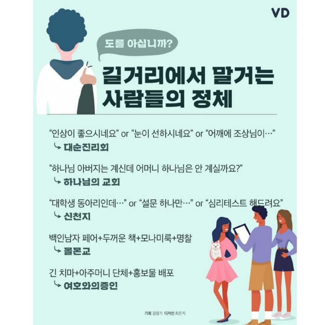 사진참고. 특히 신천지가 많이 있으며 gn-k 사잇길부터 정문을 걸처 신촌역까지의 루트에 자주 출몰한다. 애매하게 '종교동아리인데요~'라며 교내동아리인척 말거는 경우도 있으니 조심. 위치마다 영업 방식이 다른 것이 재미있는데