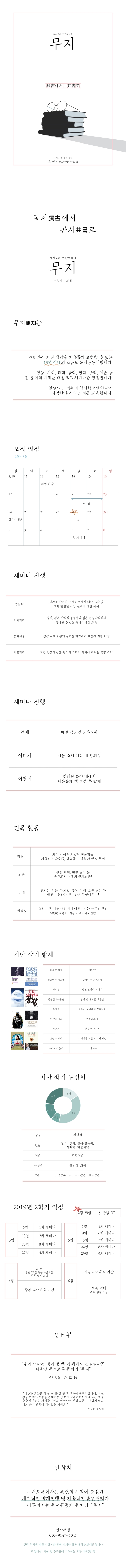 무지는 인문학, 사회과학, 자연과학, 문화예술 분야의 책을 읽고 매주 금요일 오후 7시 서울 지역의 대학교에서 토론하는 동아리입니다.