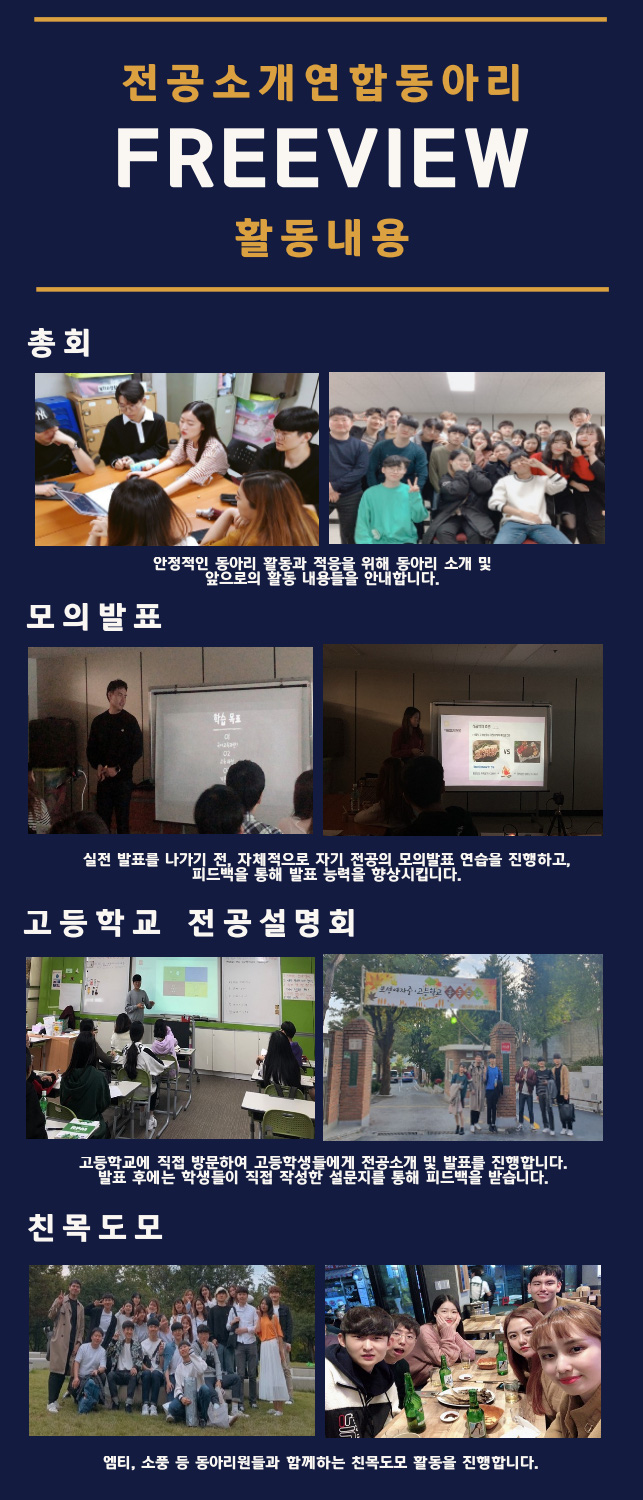 고등학생들이 전공을 이해하고 선택하는 데에 도움이 되고자 시작한 서울시립청소년센터 소속 대학생 연합동아리 FREEVIEW 입니다!