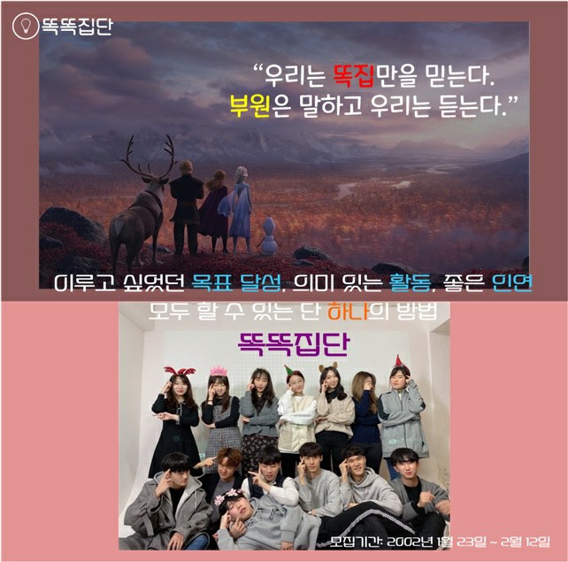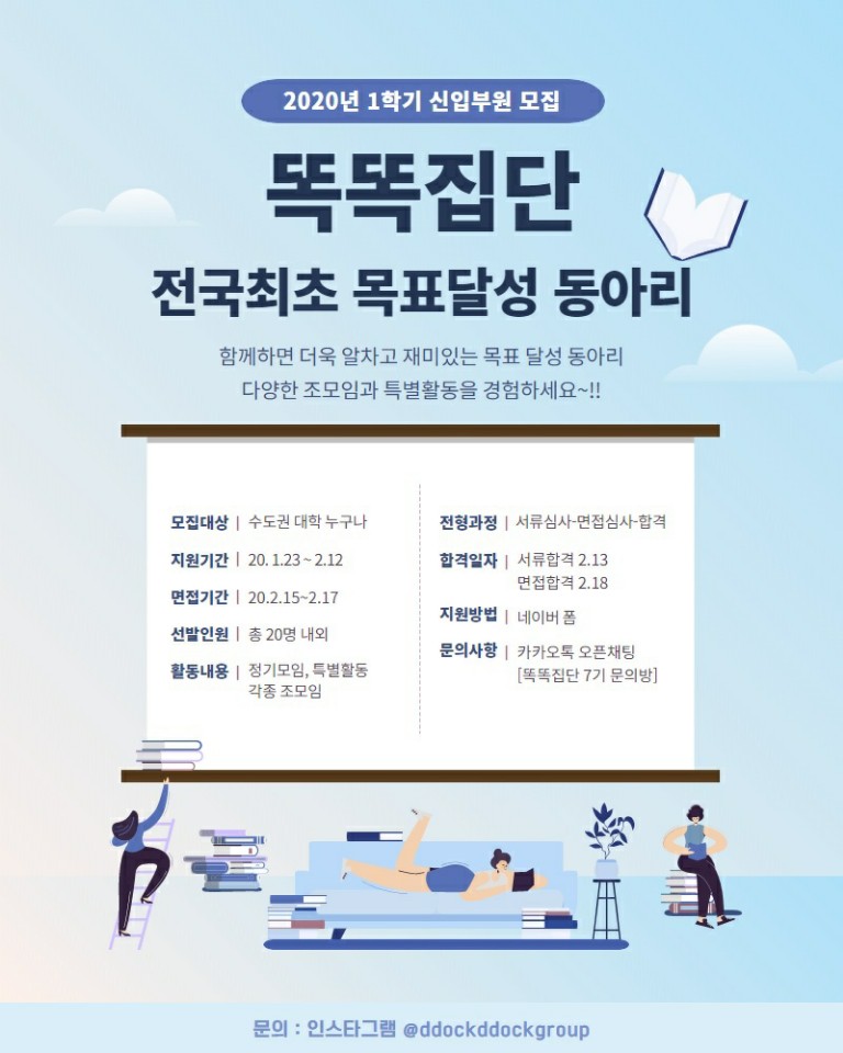 안녕하세요 ! 저희는 전국 최초! 수도권 대학생 연합 목표 달성 동아리 “똑똑집단”입니다. 의미 있는 활동도 하고 싶고, 개인적인 목표도 이루고 싶고 그러면서 사람들도 만나고 인연도 쌓고 이 세 가지를 모두 잡을 수 있는 방법을 고민하고 계시진 않으셨나요? 저희가 그 해결이 되어드리겠습니다! 잊지 못할 추억, 의미 있는 한 해, 꼭 이루고 싶었던 목표 달성, 그리고 이 모든 걸 함께 할 좋은 사람들을 통해 저희는 분명 여러분의 ‘지친 삶의 낙이 되어줄’ 동아리라 자부합니다. 우리 동아리는 1~6기를 성황리에 마치고 드디어 7기 신입 기수를 모집합니다! 이 글을 보고 “좋은데?”라고 생각하는 당신, 주저없이 지원하세요! 여러분의 대학생활에 터닝 포인트를 똑똑집단이 만들어 주리라 확신합니다:)