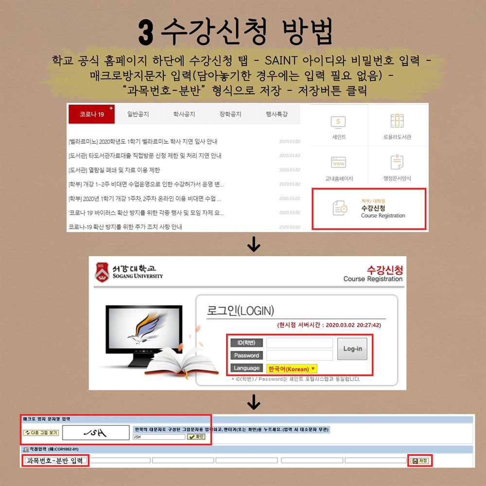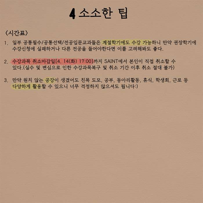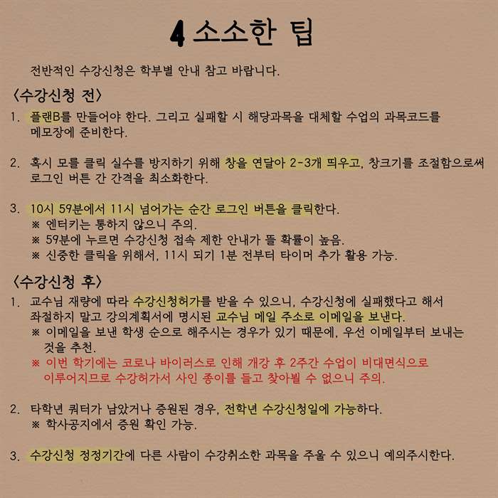 하지만 수강신청을 하루 앞둔 오늘, 총학생회에서 아무래도 코로나 때문에 선배들과의 직접적인 꿀팁을 전수받지 못해 불안한 새내기들을 위해 수강신청 공지를 올립니다.