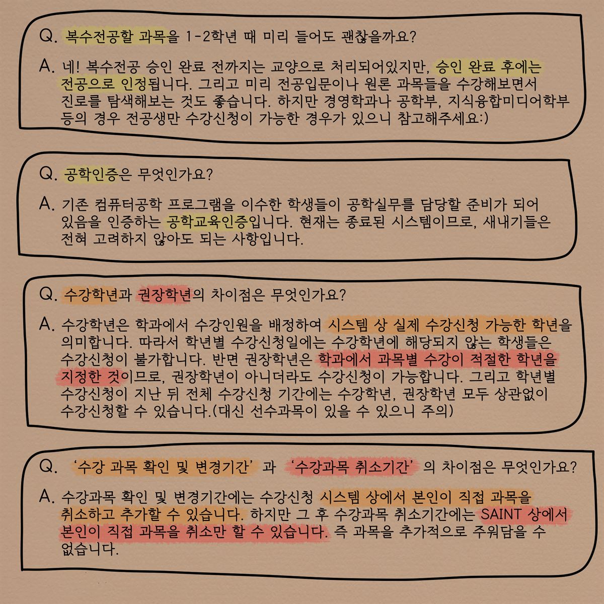 이미 각 학부별, 전공별로 새내기 카페와 단체 톡방에서 충분히 공지가 되었습니다.