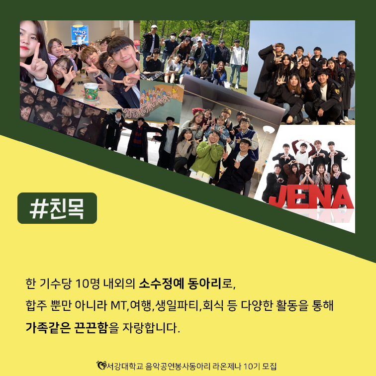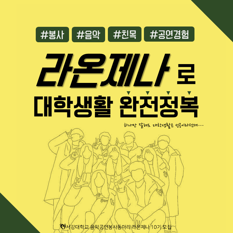 모두가 환영받는 라온제나입니다! 봉사와 음악, 친목과 공연경험 그 무엇 하나 빠지지 않는 라온제나에서 설레는 마음으로 여러분을 기다리고 있습니다. 많은 지원 바랍니다!