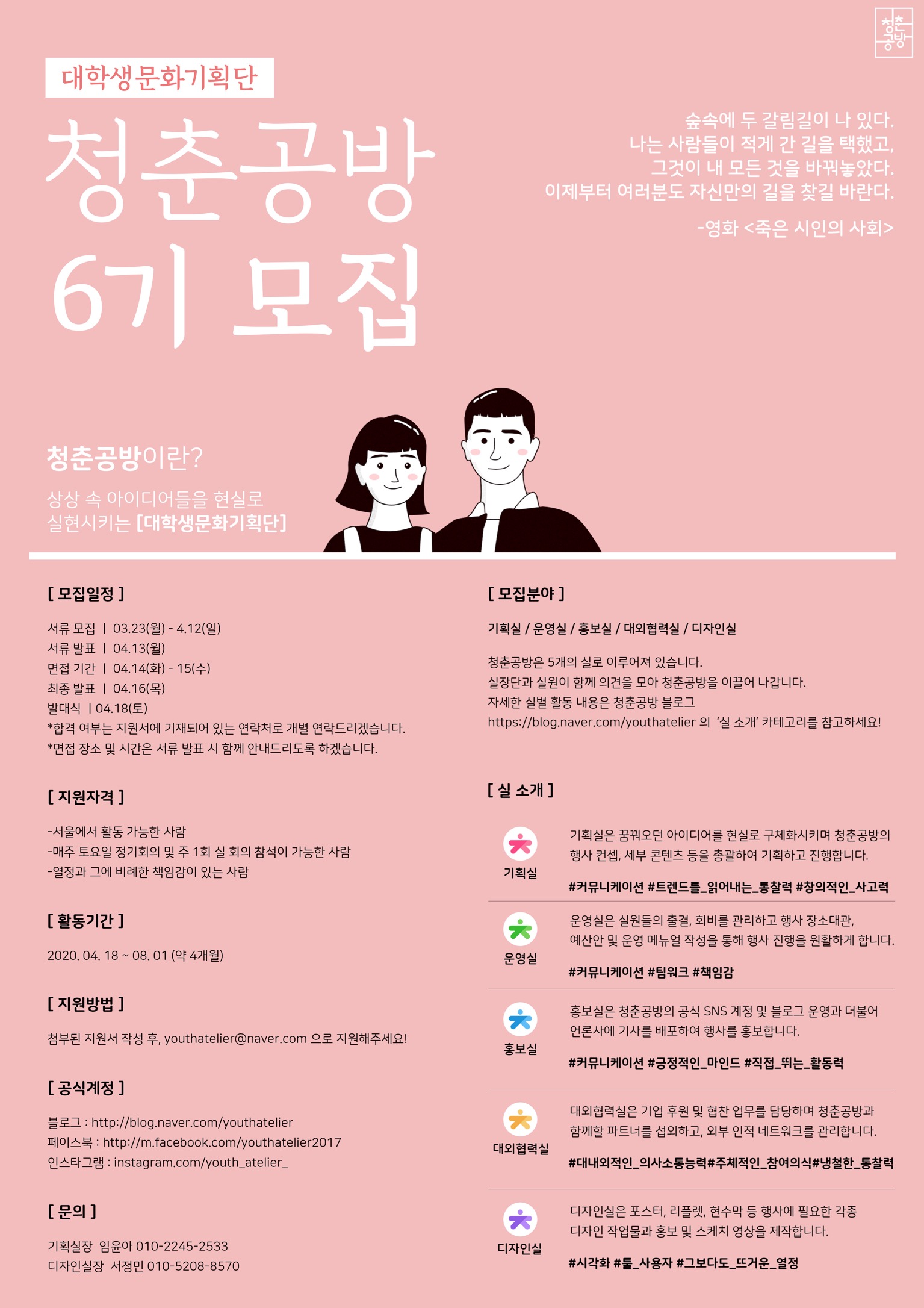 대학생문화기획단 청춘공방 6기 실원 모집 (~4월 12일)