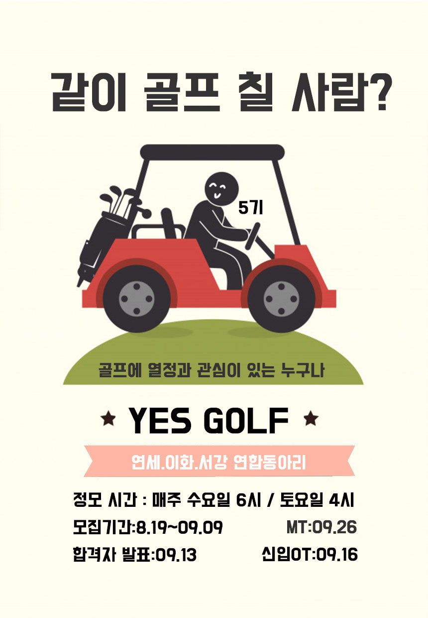 최초의 신촌연합 골프동아리에서 5기 신입을 모집합니다 나이/학번/실력 모두 무관 골프채가 없어도 연습장에서 대여 가능하니 골프에 대한 관심과 열정만 가지고 지원해주세요!