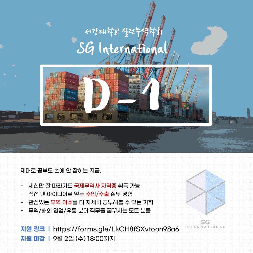 서강대 실전 무역학회 SG INTERNATIONAL의 10기 학회원 모집이 하루 남았으니, 망설이시는 분들은 서둘러 지원해주세요!